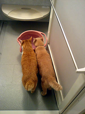 二人してお風呂場の汲み置きのバケツ水を飲んでおります。